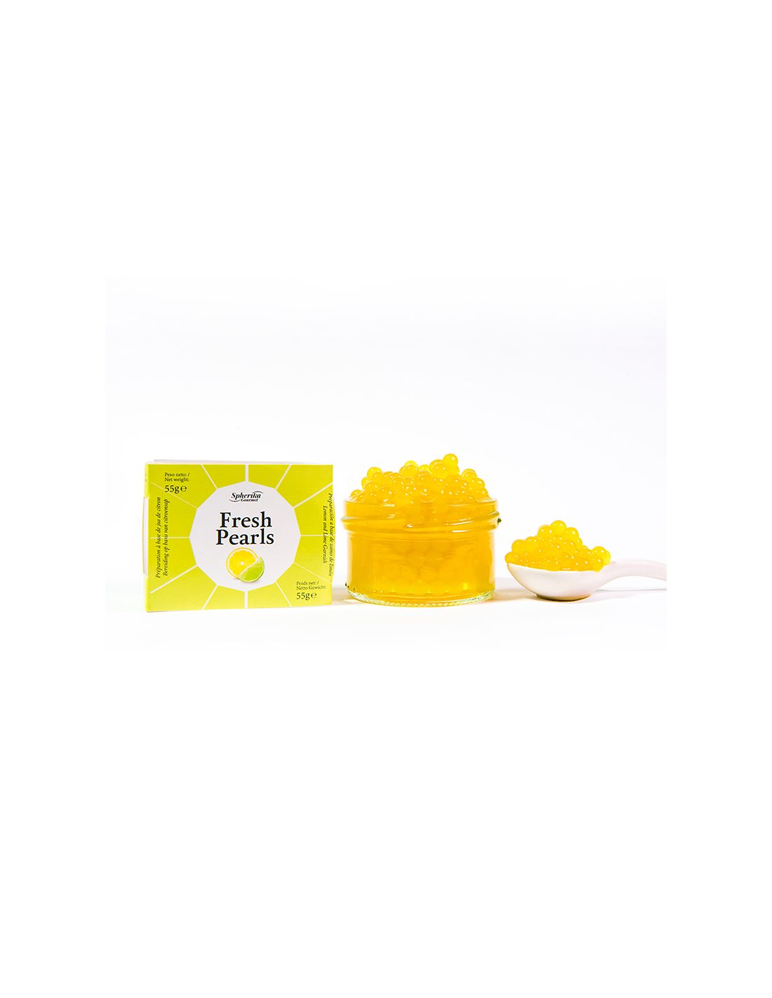 Elaboradas con la técnica de esferificación Inversa, que consiste en el arte de transformar líquidos en esferas, se obtienen atractivas perlas homogéneas y brillantes que dejan al descubierto sus sabores dulces y salados una vez que están en la boca. Extravagantes y versátiles, son un toque glamuroso y sofisticado para cualquier plato.