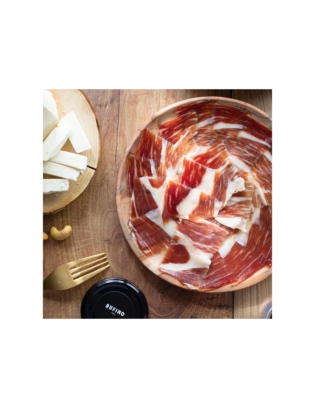 Jamón procedente de cerdos 50% ibéricos alimentados con cereales de alta calidad y curado durante mínimo 24 meses en bodegas naturales de Guijuelo (Salamanca) donde adquiere los característicos aromas y matices del buen jamón ibérico.